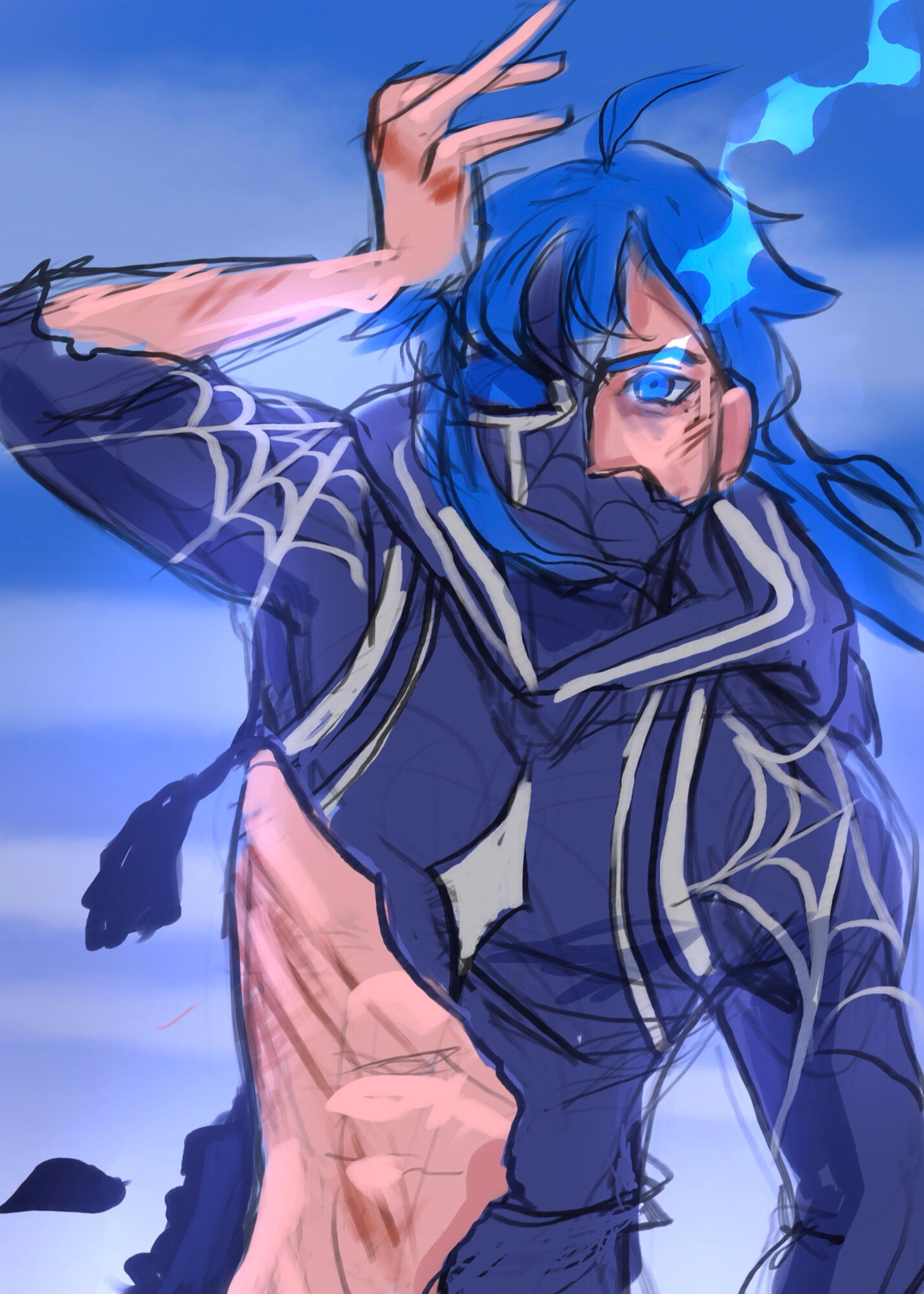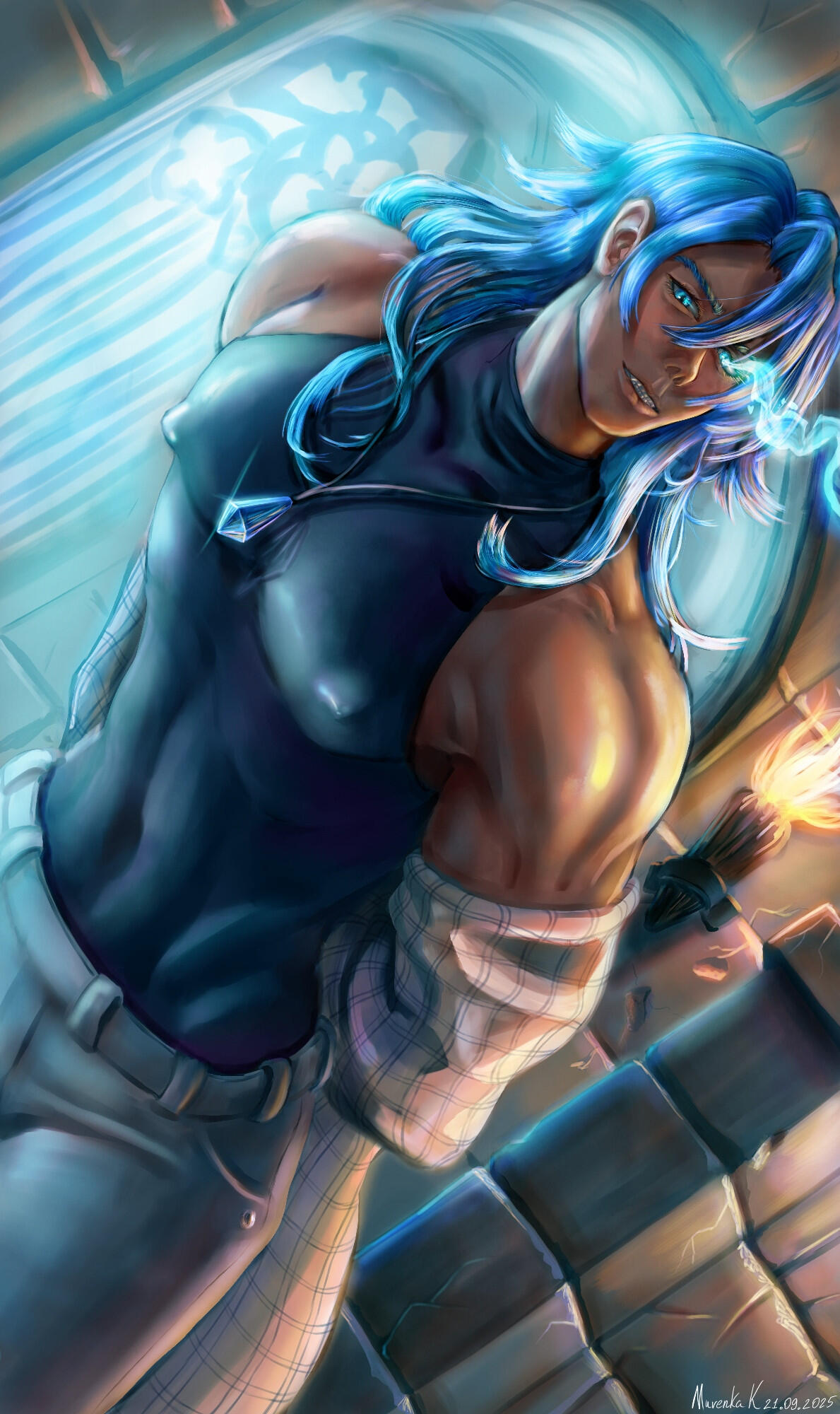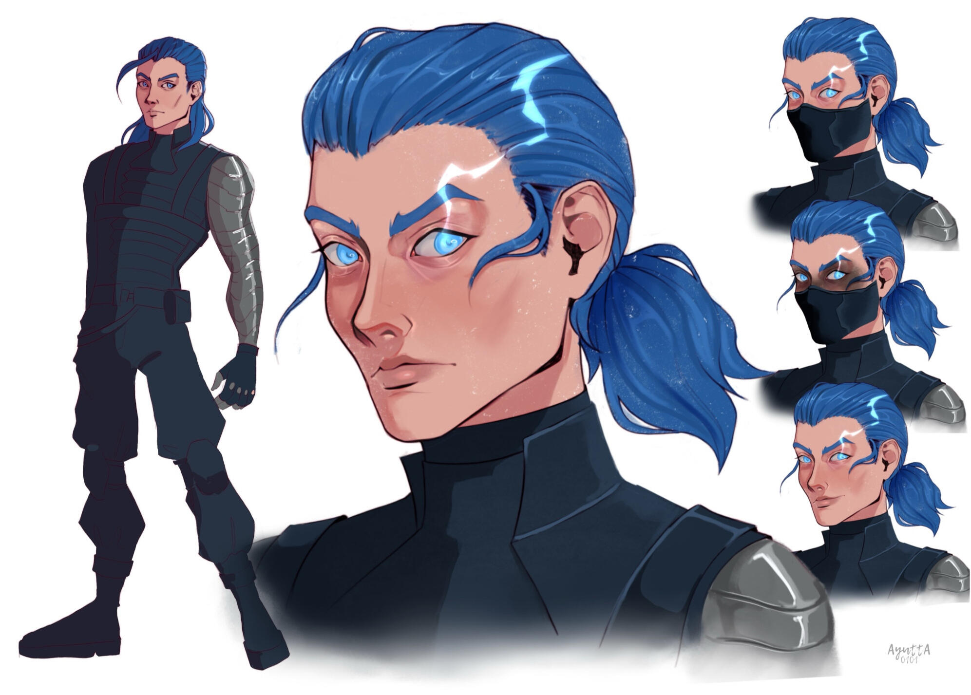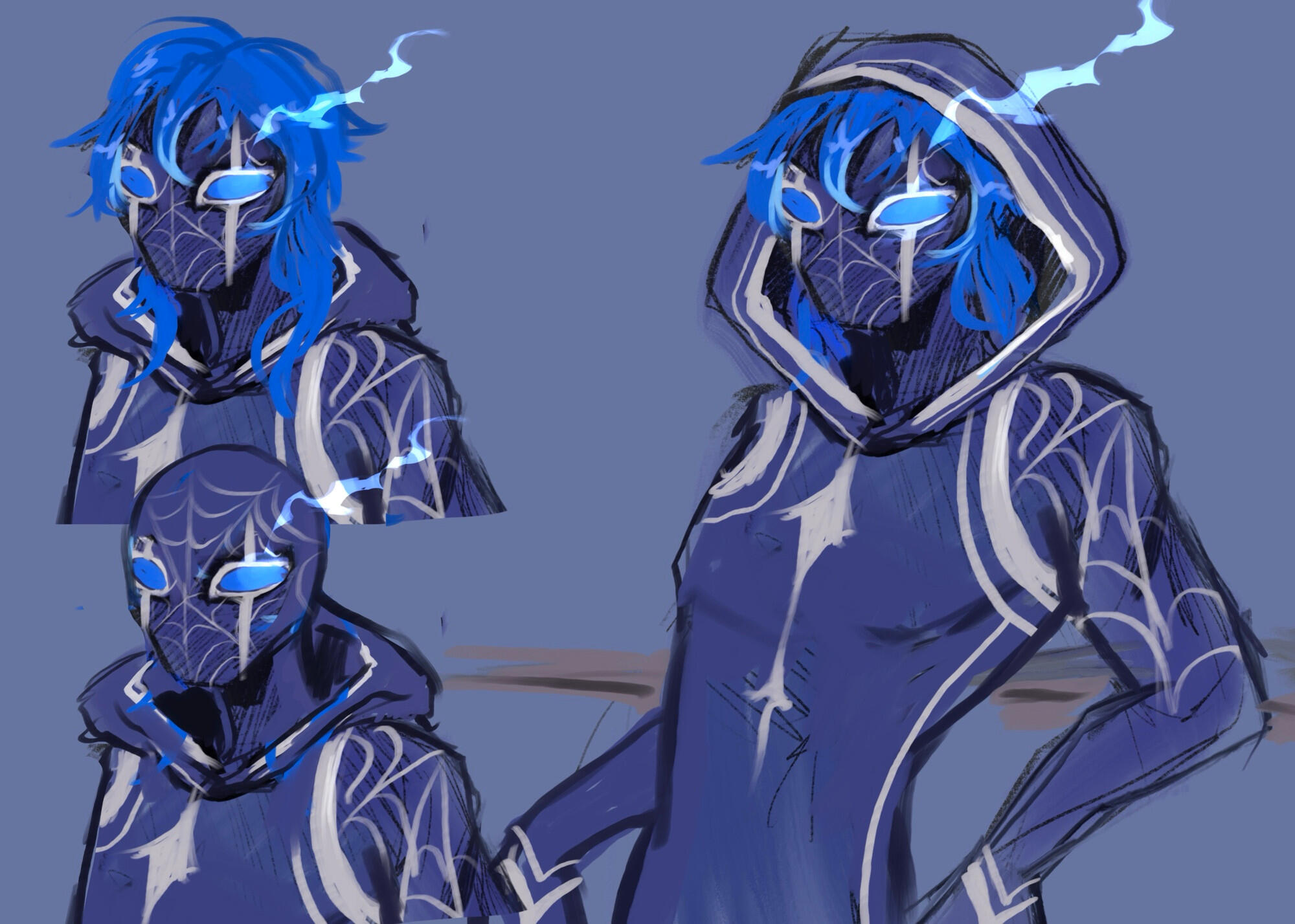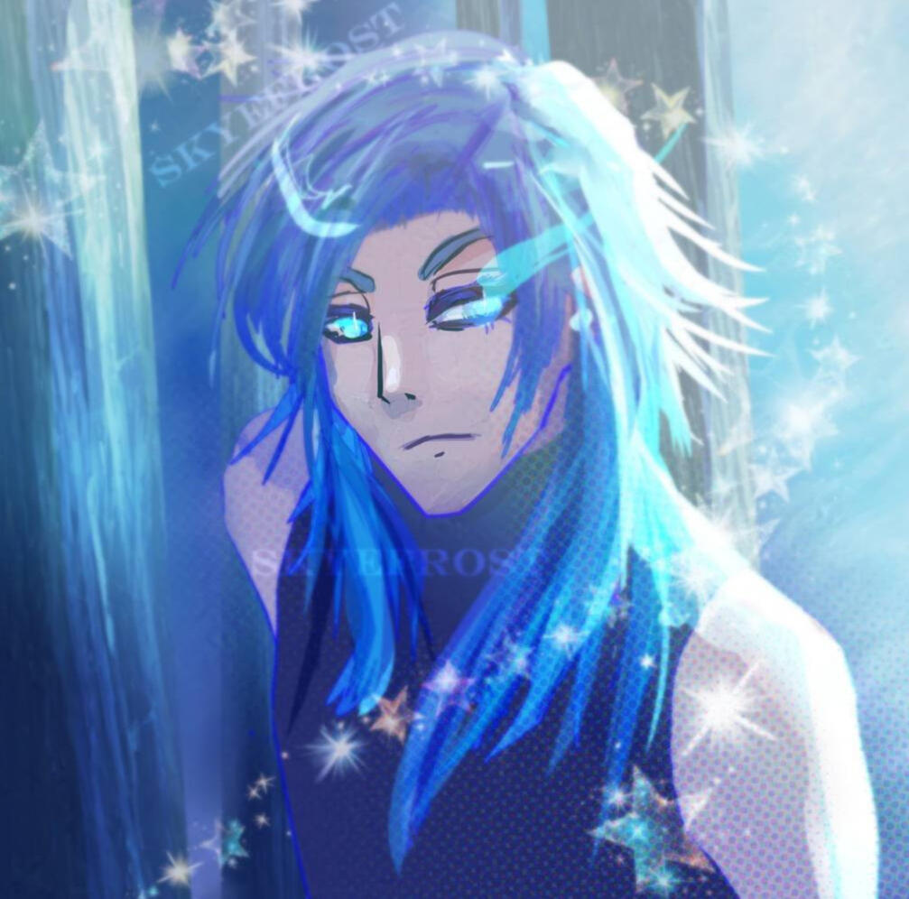 Eye color: Bright blue, with sparks of lightHair: Shoulder-length, vivid blueDistinguishing features: Can shapeshift at will, but the blue hair and eyes always stay.Style: Depends entirely on the mood.