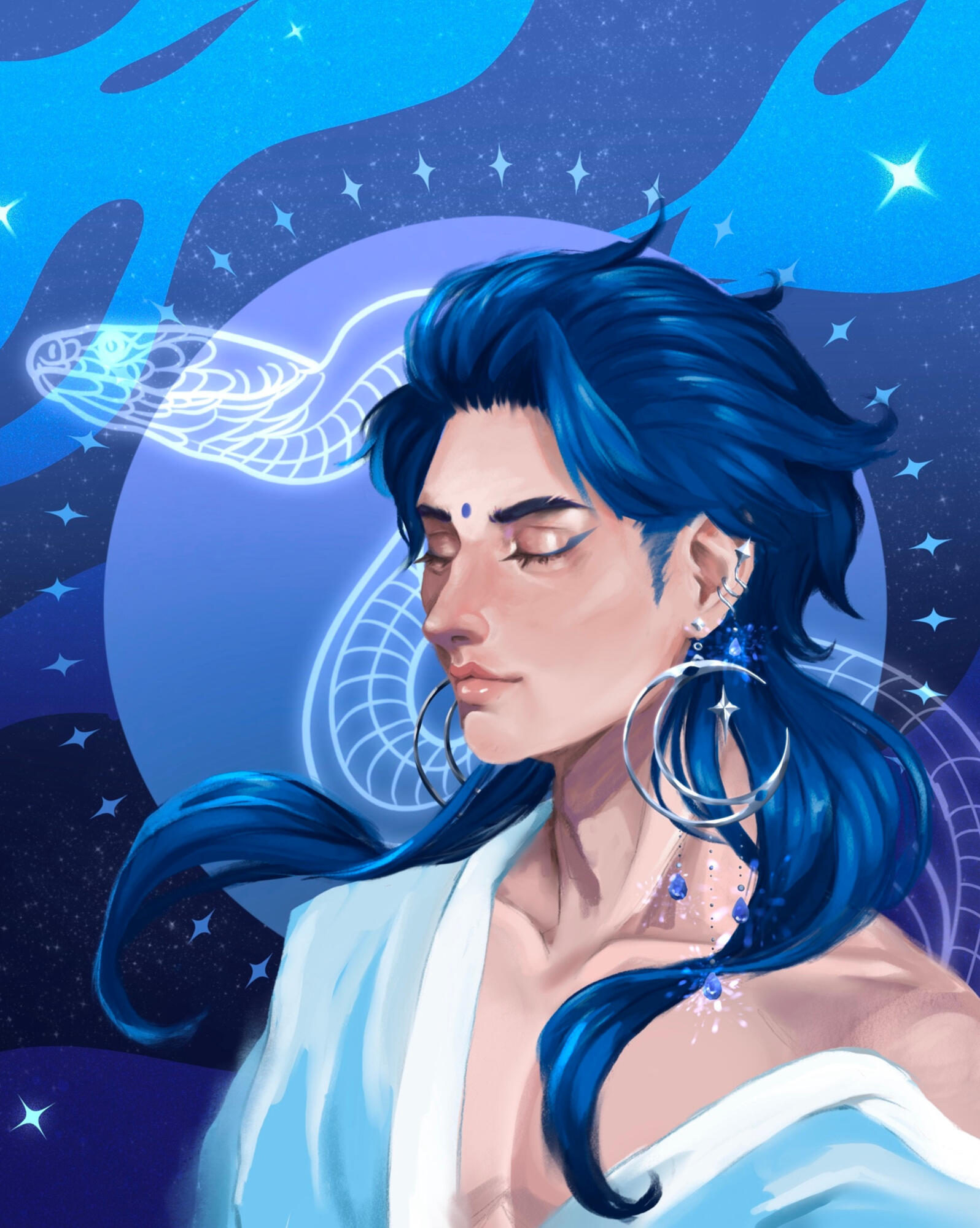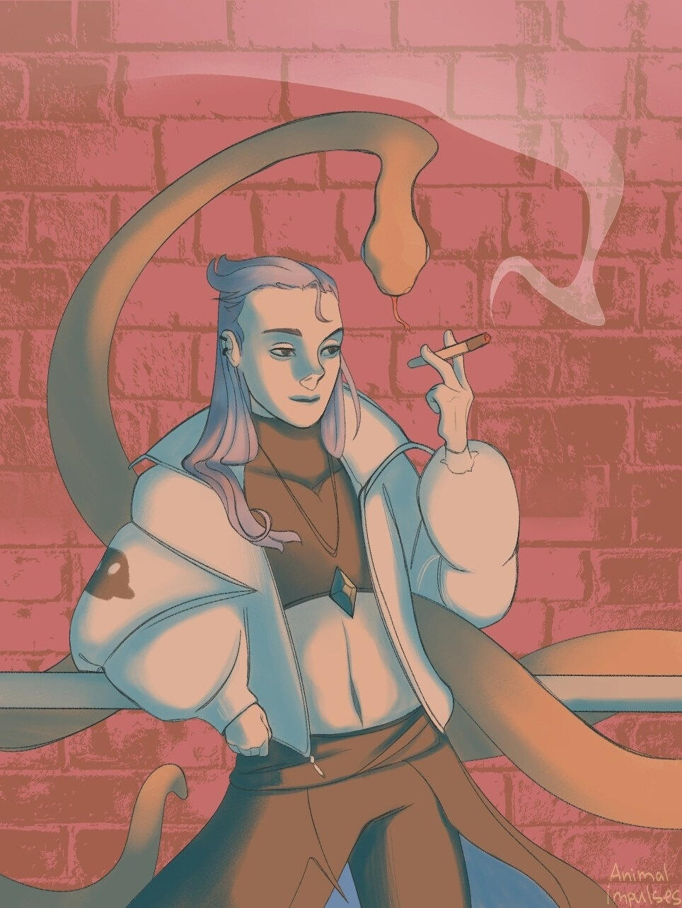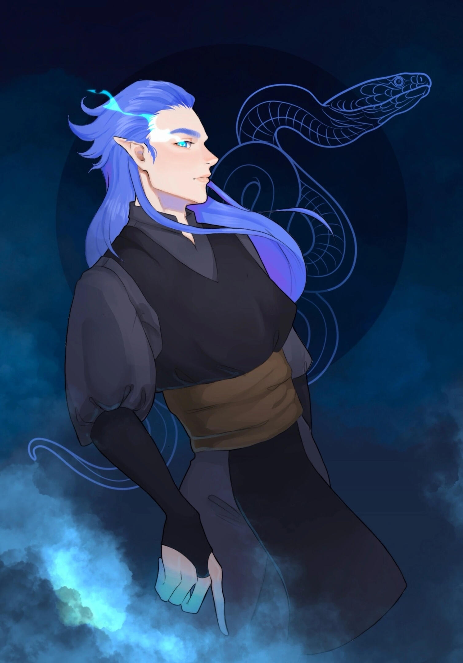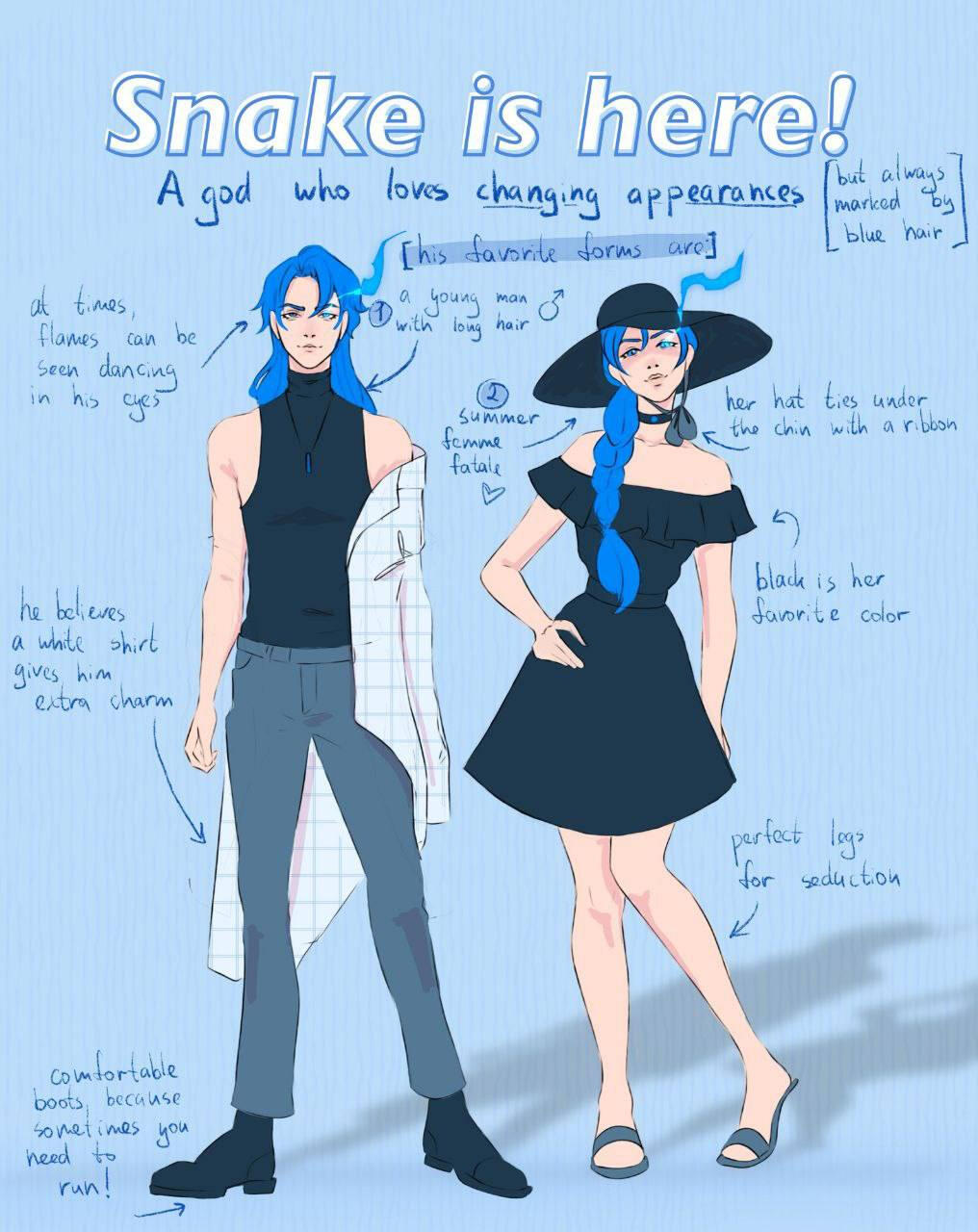 Snake is a fallen god who used to be very good at manipulating people and getting what he wanted. He killed the Blue Dragon and put on its hide, which fused with him and broke most of his divine powers.His ability is shapeshifting: he can become male or female, old or young, any face or form — but his hair is always bright blue.