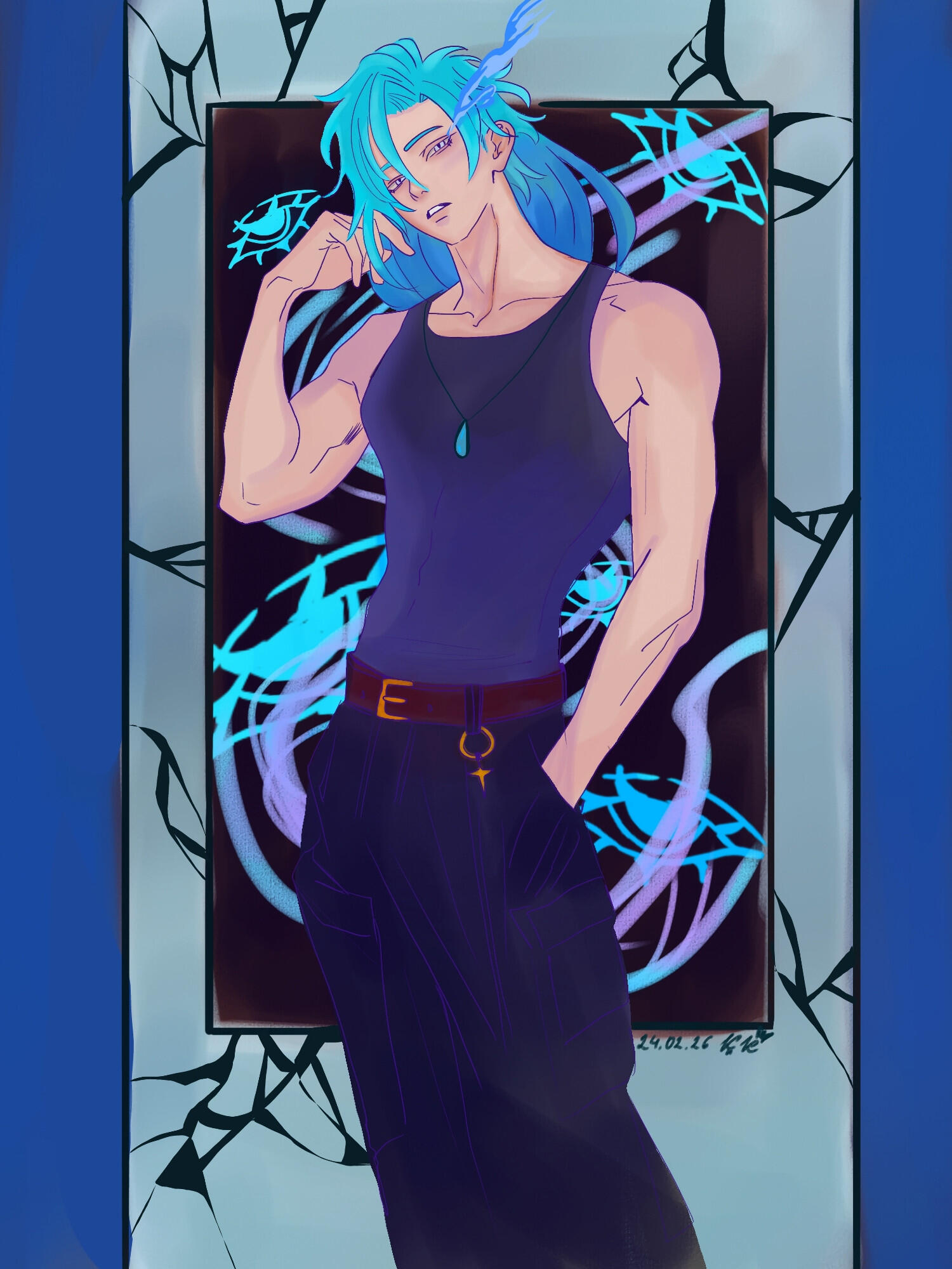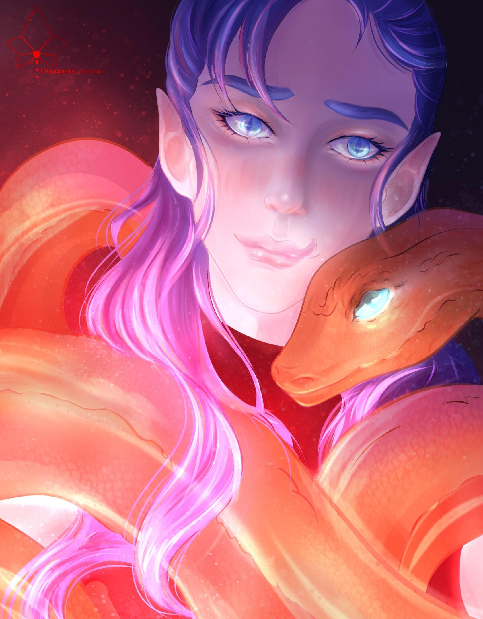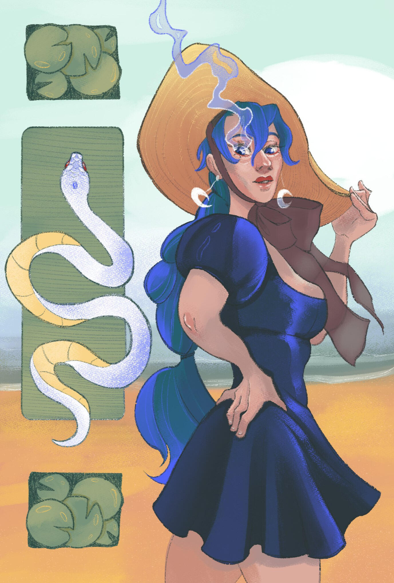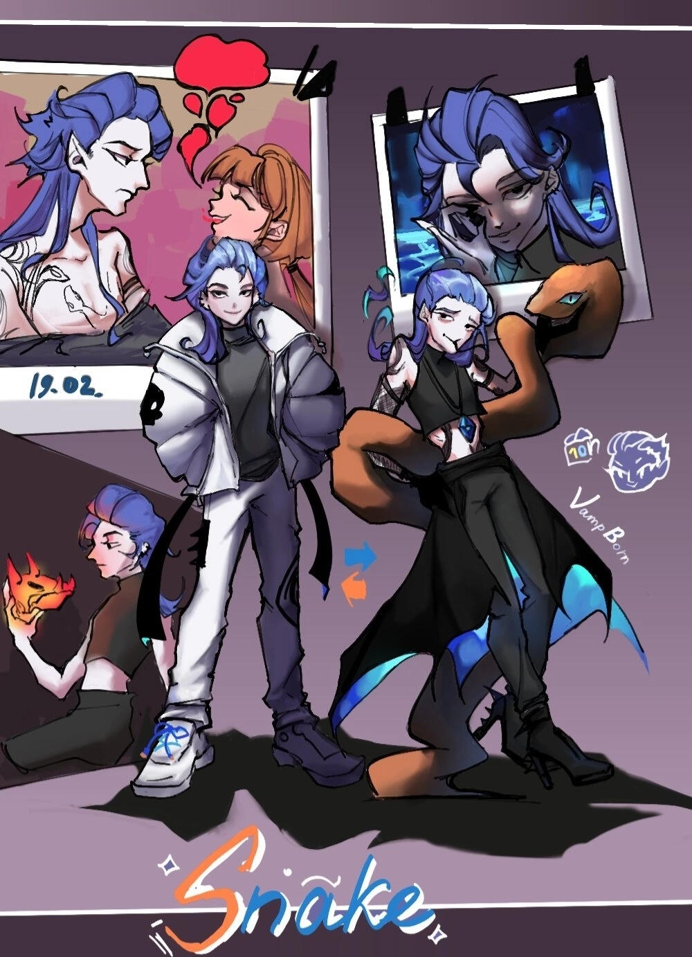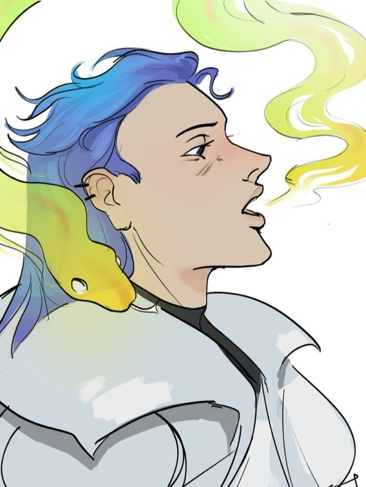 Snake is a fallen god who used to be very good at manipulating people and getting what he wanted. He killed the Blue Dragon and put on its hide, which fused with him and broke most of his divine powers.His ability is shapeshifting: he can become male or female, old or young, any face or form — but his hair is always bright blue.